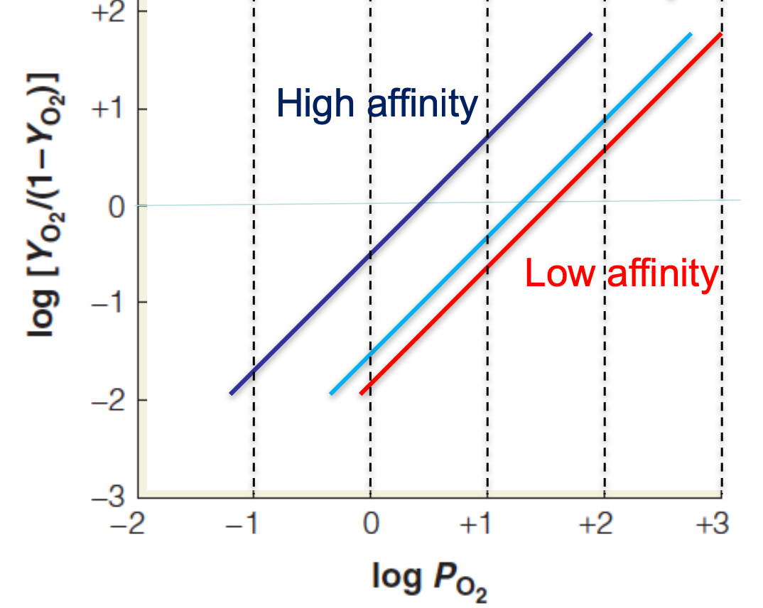 그래서 log(PO2)에 따라 그래프가 양수인지, 음수인지, 아니면 0에 위치하는지 단순히 비교함으로써 미오글로빈이 해당 분압에서 어떤 상황에 있는지 쉽게 판단할 수가 있다.