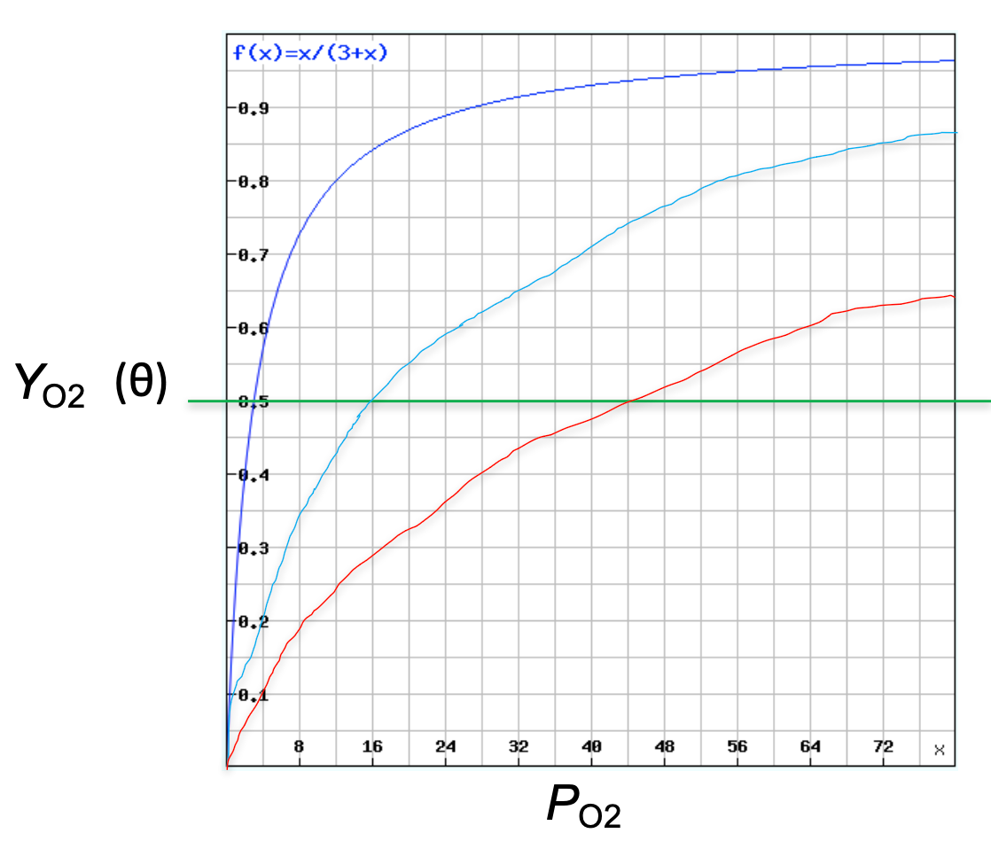 우선 상수인 3, 16, 44에 해당하는 것이 P50, 즉 미오글로빈의 절반이 산소로 포화되었을 때의 산소 분압이다. 이 수치가 작을수록 미오글로빈의 산소에 대한 친화도가 높다고 판단할 수 있다. (적은 산소로도 미오글로빈이 산소로 많이 포화되기 때문) Hyperbolic 형태로 나타냈을 때 세로축의 YO2는 포화도이므로 0부터 1까지의 범위를 가진다. 그래서 붉은색이나 하늘색으로 나타난 그래프도 PO2가 계속해서 증가하다보면 언젠가는 1에 가깝게 도달한다. 다만 여기서는 공간이 부족해서 생략된 것이라 할 수 있다.